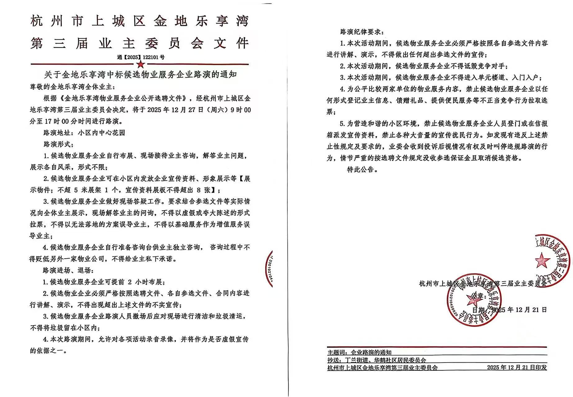 而第三届业委会的成立过程就伴随着排斥异见的声音,这让不少业主质疑其组建动机,“无利不起早”的猜测在业主间悄然流传。更让业主感到费解的是,小区电梯因未装空调,在高温天气里让居民苦不堪言,现任物业计划安装风幕机改善这一情况,却遭到不明力量阻拦。与此同时,现任物业因投标争议将业委会诉至法院,业委会却未等法院判决结果出炉,便急匆匆推进新物业的选举流程。有业主反映,关于新物业27号路演的通知,前一晚电梯内还未张贴,次日一早便突然出现,如此仓促且缺乏充分公示的操作,进一步加剧了业主的疑虑。